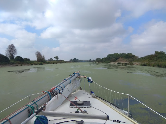 Hola navegantes. Hoy voy a contaros los momentos malos, que claro que también los hubo. El susto en el desembarco del camión en Port La Nouvelle. El único sitio que encontramos para hacerlo fue en un muelle de piedra, donde había que pasar el barco por encima de un pantalán flotante, el que veis en la foto. Había seis u ocho metros hasta el otro lado del pantalán. A mitad de la maniobra, con la tonelada y media del barco tan alejada del camión y el brazo de la grúa estirado en horizontal, empezaron a levantarse del suelo las patas del camión del lado contrario. En una nube como las de los cómics vi a mi barco estrellado en el pantalán y el viaje abortado, pero por suerte no pasó. Interrumpimos la varada y cambiamos de sitio (entrada del blog de 10-6-21). Los problemas para encontrar atraque en el entorno de Roma, lo que nos obligó a pasar algunas noches fondeados, con menos comodidades y sin poder desembarcar. Llegamos a la conclusión de que los navegantes de Roma, para sus vacaciones, se apropian para dos o tres meses de las plazas que están pensadas para estancias cortas, de uno o dos días, dejándonos sin ellas a los de tránsito. Se repitió en el Sur del Adriático, esta vez por la saturación de los puertos con los barcos que quieren dar el salto a Grecia (entradas del blog de 28 y 29-6-21). La noche fondeados y garreando al Sur del Promontorio Gargano, por no haber alcanzado el puerto de Vieste debido a las fuertes rachas (entradas del blog de 18 y 19-8-21). En el puertecito de Mattinata no nos acogieron a pesar de la meteorología. El fondeo garreaba en un fondo de algas, y hasta nos agarramos a una boya y también a esa la hacíamos garrear. Estuvimos pensando, incluso, pedir ayuda a uno de los veleros grandes que también habían fondeado allí, que aparentemente aguantaban bien, para que nos dejasen amarrarnos a su popa. A la 1:30 h. un velero más grande, que había fondeado después que nosotros, se puso a garrear, y nosotros también, y estábamos a punto de colisionar. Viendo que quedaban pocos minutos para la que la luna se metiera y nos íbamos a quedar a oscuras, nos fuimos a buscar una segunda boya a la que agarrarnos, cruzando los dedos para que aguantase hasta que alumbrara el día. Pero ni eso se cumplió, porque a las 5.00 h. el viento refrescó y la boya se puso a garrear, teniendo que dejarla antes de salir el sol. Sin haber dormido y hechos polvo seguimos de noche en dirección a Vieste. El track de aquella noche da fe de lo mal que lo pasamos. Los fallos del piloto automático, que nos obligaron a navegar muchas jornadas pilotando a mano, lo que al cabo de 10 o 12 horas se hace insoportable. Hicimos hasta un circuito nuevo desde la batería para intentar solucionarlo, que no funcionó (entrada del blog de 5-7-21). Finalmente se debió a una pieza defectuosa, y como el piloto era nuevo me la sustituyeron dentro de la garantía, pero ya al volver a Santander. Las dos roturas del espí, una rifadura de lado a lado que primero nos cosieron en una velería de Salerno, volvió a romperse por la costura, y finalmente conseguimos comprar uno de segunda mano en Sicilia para terminar el viaje. Esos días sin espí nos vimos perjudicados porque perdemos un nudo o nudo y medio de velocidad sin su ayuda (entrada de 10-7-21). La tromba de agua una noche antes del amanecer, frente a San Bennedetto, en el Adriático. Caía tanta agua que aplanaba las olas, y veíamos que fuera del aguacero las crestas rompían, pero dentro del aguacero se quedaban planchadas. El viento variaba de dirección (del Oeste al Noroeste) y fuerza (6 ó 7 en los chubascos, 2 ó 3 entre ellos) teniendo que ponernos a la capa para poder manejar la situación, porque navegar era imposible (entrada del blog de 25-8-21). El día que nos alcanzó el temido viento Bora, en el Adriático al Norte de Ancona. Estando ya en el mar recibimos un aviso de Securité de viento del Este de fuerza 7. Hay que tener en cuenta que en el pronóstico se da el viento “promedio”, pero que en las rachas aumenta uno o dos grados Beaufort. Sólo con el génova a menos del 50%, sin vela mayor, corríamos a 6 nudos, con picos de más de 7. Yo no había recibido tanto viento en la vida. Toda la superficie de las olas (incluso los valles) levantaba espumarajos blancos, y no sólo las crestas como en las rompientes habituales. Juan y yo casi no nos oíamos por el rugido del viento y teníamos que hablarnos a gritos. Y lo que es peor, teníamos la costa a sotavento, a escasos quinientos metros (entrada del blog de 28-8-21). La colmatación de algas en el Río Po, antes de Mantova, que nos produjo un calentón del fueraborda (entrada del blog de 17-9-21). ![]() Y en general los altos precios y la mala calidad de las marinas en Italia. Por suerte estos momentos malos ya han pasado al anecdotario y allí están bien. Con cuidado, navegantes.