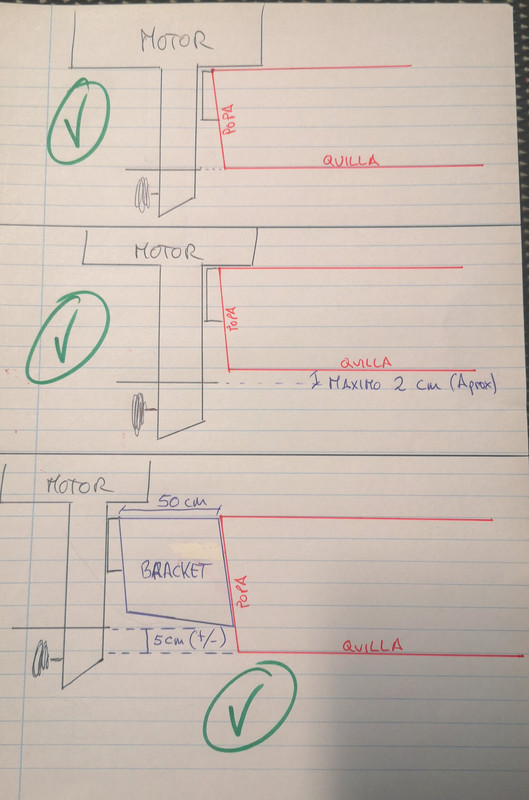 El dibujo 3 depende de la forma y colocación del bracket, pero por lo general hay que aplicar una relación de "10 a 1". Es decir, por cada 10 centímetros que la cola se aleje del espejo de popa, hay que subirlo 1 centímetro. Esto es por lo general, pero como digo depende mucho del tipo de bracket. Luego hay que probar en el agua, ya que esto no es infalible. Con 50cm alejado del espejo, en una lancha puede ir mejor que suba 4 cm y en otra que suba 6cm.