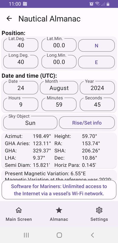 A mi que estudie el CY por libre y en la meseta, y sin sextante, me resultó super util la web stellarium, que ademas no necesita que instales nada de nada. Te da casi todo lo que puedas necesitar, lat/long, azimuths y alturas de astros y planetas…