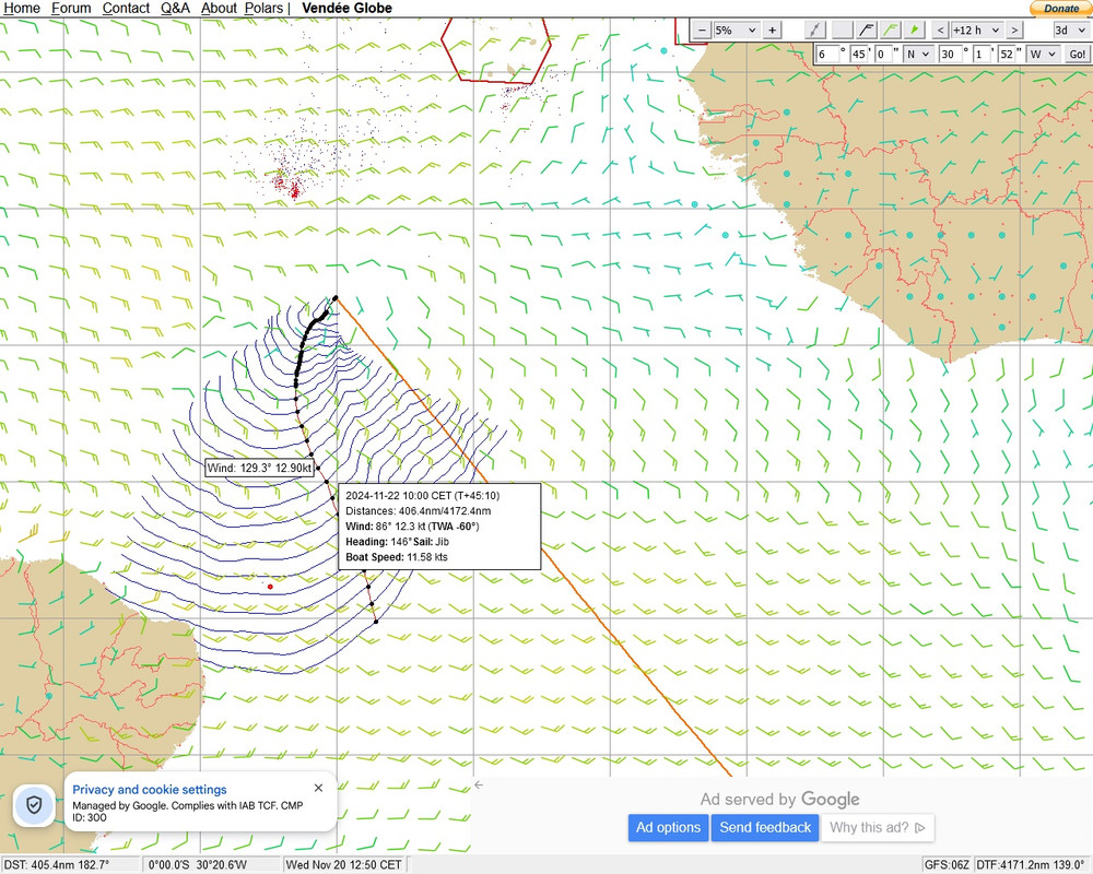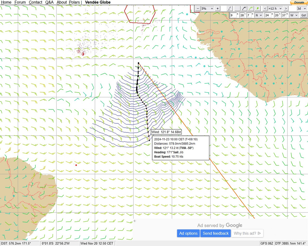 Un par de pruebas con Zezo. Tomando la posición de Le Cam y pidiendo ir al 45S 30E y diciéndole que solo haga la ruta de 3 días (es diferente si le pides tener en cuenta los 16 que calcula), sorprende en primer lugar ver que actualmente está siguiendo con exactitud la ruta que había puesto ayer, y calcula el paso del ecuador para el día 23 a las 10 de la mañana.