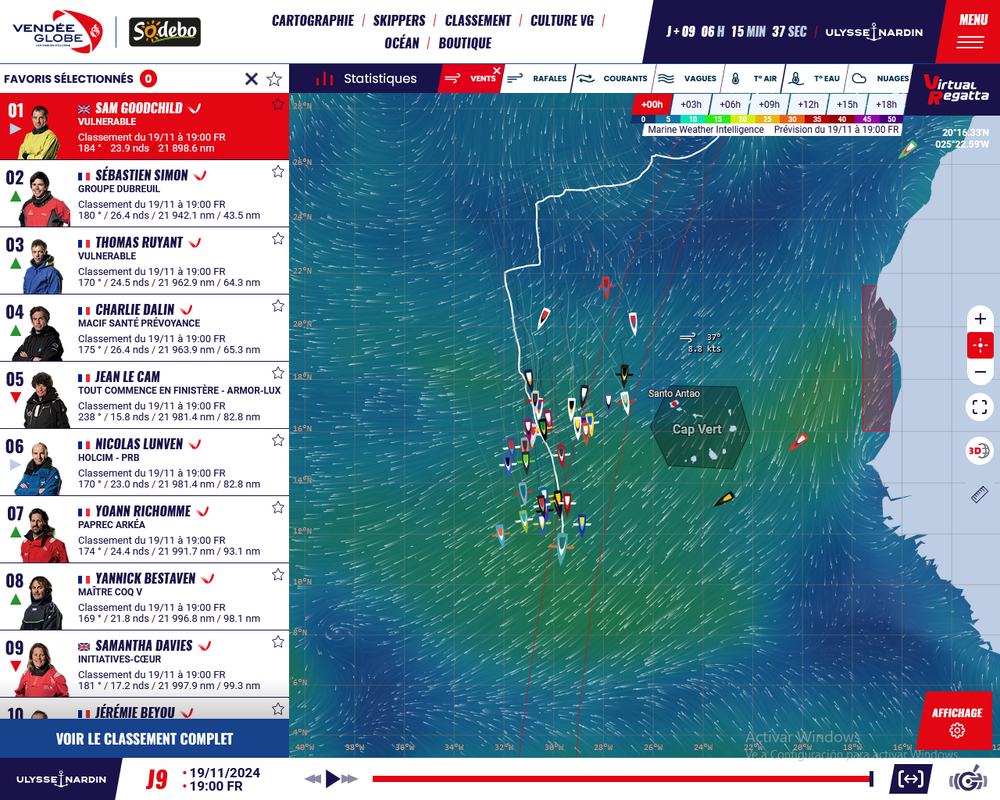 Las posiciones a las 15. acaban de salir Le Cam pierde el liderato a favor del Vulnerable de Sam Goldchild. Sam es fantástico su barco es el anterior de Ruyant no lo olvidemos, en teoría más lento. Pero muchos se preguntan si un no francés podría ganar esta regata, y a mi me empieza a gustar la idea