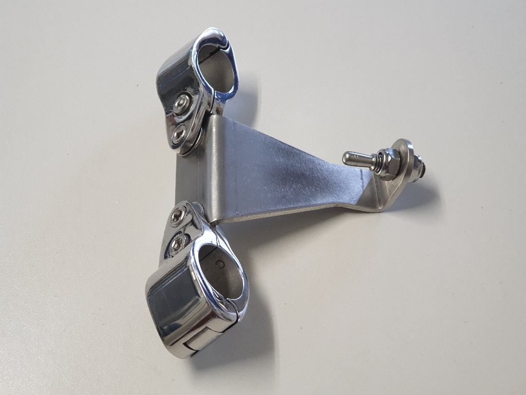 La parte delantera es una chapa inox de 3mm recortada, doblada convenientemente, atornillada a dos abrazaderas de bimini.