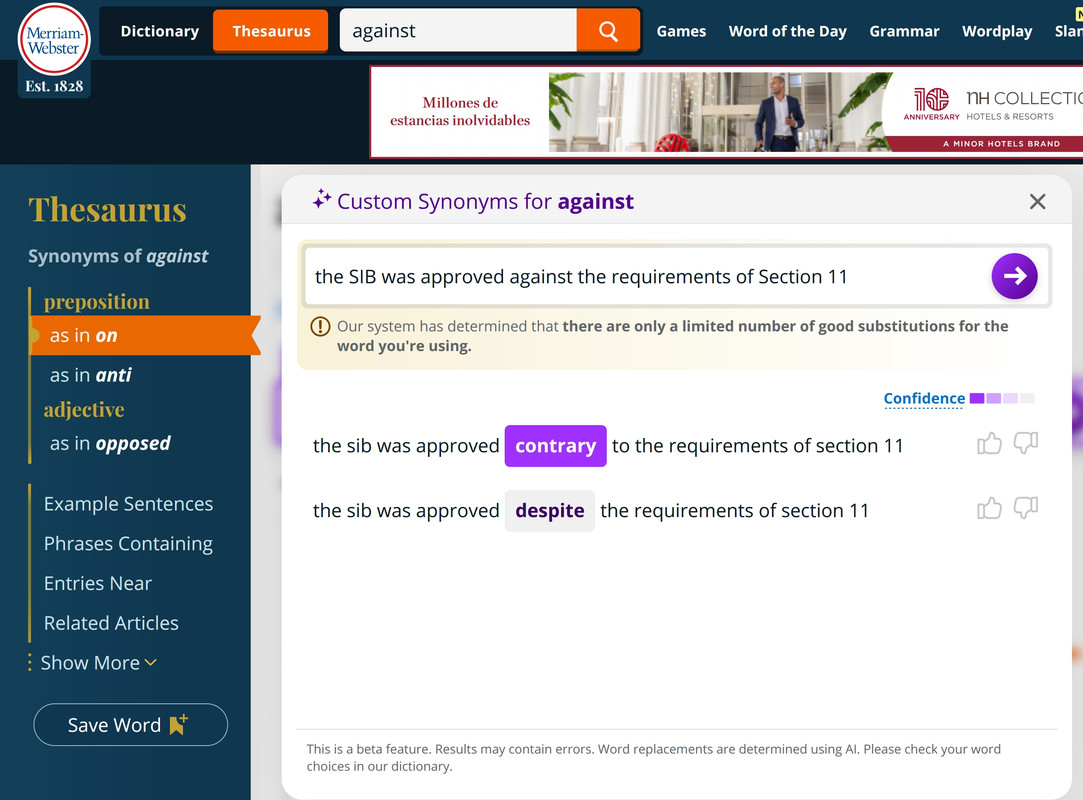 Ejemplo: si decimos "checked against a document" estamos indicando que algo se comprobó con respecto a un documento (no se infiere nada sobre el resultado de la comprobación), pero si decimos "approved against a document" - tal como dice el informe del MAIB - estamos indicando que se tomó una decisión contraria a lo establecido en el documento, porque si no, tendríamos que decir "approved in accordance with a document". Saludos y ![]()