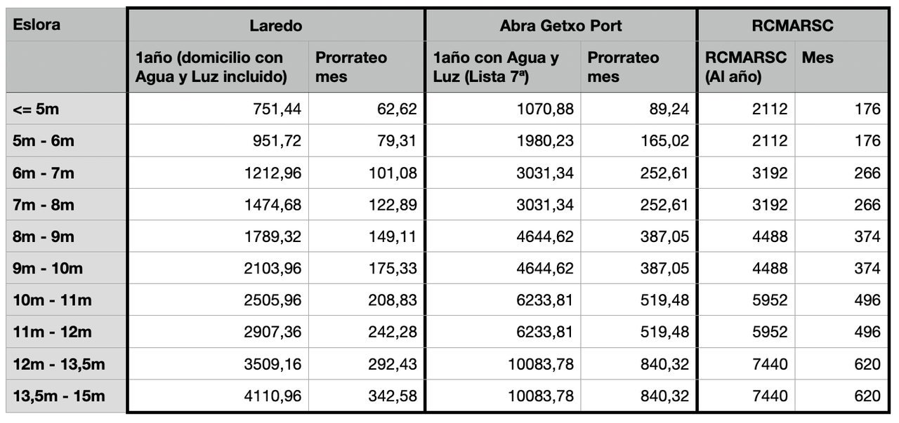 Una cosa que me parece curiosa es que hay gente que dice que las tarifas de la nueva concesionaria de Getxo no son una subida tan exagerada respecto a lo que se venía pagando. Desconozco lo que se venía pagando hasta 2024, pero usando la informacion disponible en la web de las tarifas para el 2025 de los puertos de Laredo, del Abra Getxo Port y del Real Club Marítimo del Abra he hecho esta tabla: ![]() La informacion la he sacado de estos enlaces: https://www.puertodeportivodelaredo.es/tarifas https://www.abragetxoport.com/wp-con...EB-PDG-v06.pdf https://www.rcmarsc.es/puerto/amarres Y puedo entender que la gente se vaya a Laredo según que eslora y que uso le des a la embarcacion. Lo que me ha parecido curioso es que el Real Club Marítimo del Abra no está tan lejos en precios de lo que propone la nueva concesionaria de Getxo Abra Port. Por favor, si encontrais algún error en la tabla decidme y lo corrijo. Contrastad vosotros mismos con los enlaces. Buena proa |