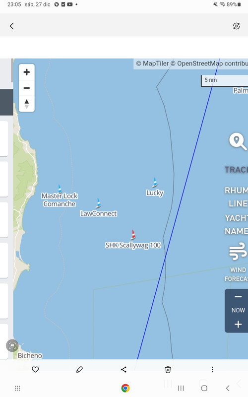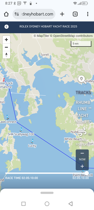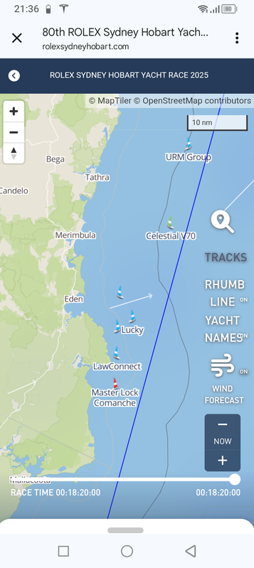 ![]() track https://rolexsydneyhobart.com/race/2025/tracker el Comanche va delante seguido del law connect pero como van con viento en contra de unos 20kn de SSW resulta que respecto a la posición del comanche en el año 2017 llevan un retraso muy importante ![]() Editado por maka en 26-12-2025 a las 21:46. |