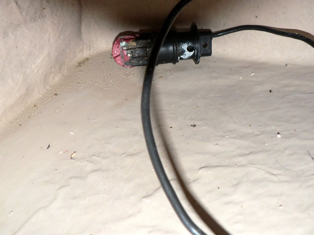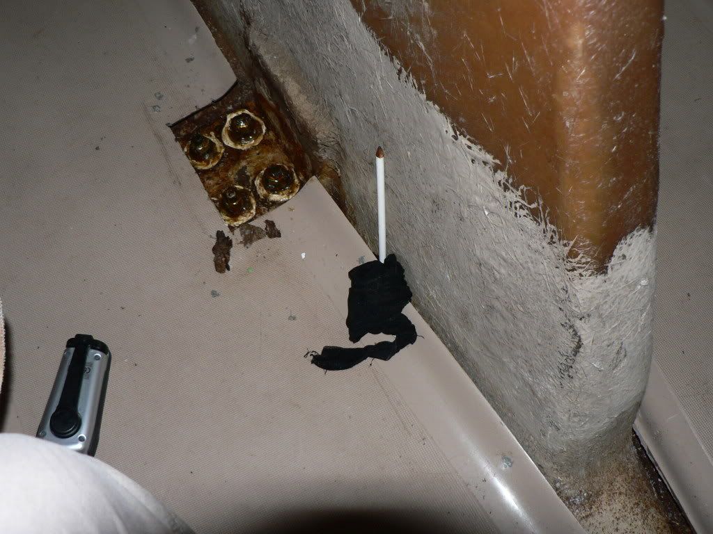 , ya que todos los pasacascos estan secos y los tornillos de la orza están bien puestos y aislados. Pegado a la caja de la orza a unos 5 cm de distancia hay un cordon de resina por debajo del piso, que dibuja como un reguero y el agua andaba por ahí. Le he pasado un trapo metido con un lápiz pues los dedos no entraban y ya está.