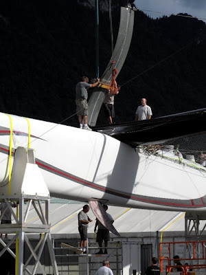 Esa estructura en Y es una celosía espacial. Ese puntal que aparece en la foto está justo debajo de la unión de los tres brazos de la Y. Los tirantes que parten de la base conectan con los extremos de cada brazo, de esta forma ayudan al aka de proa a sostener el palo, dándole mas rigidez. Ya hay fotos de como se están haciendo las velas de alinghi, así que en principio nada de velas rígidas.