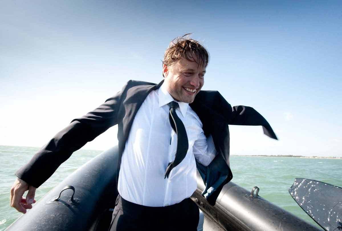 Alex Thomson, despues de hacer esqui traccionado por su 60 pies IMOCA, riza el rizo y hace surf sobre la quilla de su barco HUGO BOSS, como no podia ser de otro modo, vestido de la marca .