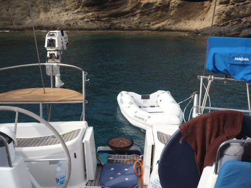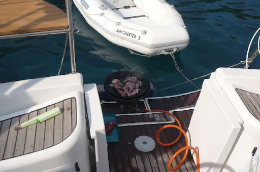 La barbacoa tiene la ventaja que por mas viento que haga nunca se apaga, y aunque el barco se menee, al estar en la popa la oscilacion es minima. Para evitar manchar la bañera lo que hago es mojarla con agua de mar antes de empezar, asi el aceite cae encima de algua y no mancha. Cualquier aclaracion a vuestra disposicion unas