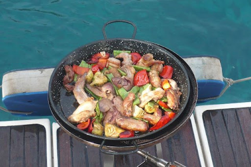 No veo muy claro el tema de cocinar una paella a bordo, más que nada por el tema de la altura de las paredes de la propia paella. Pero siempre puedes cocinar del mismo modo y con los mismos ingredientes un arroz caldoso, que nada tiene que envidiar a una paella, y te más garantías de una comida exitosa.