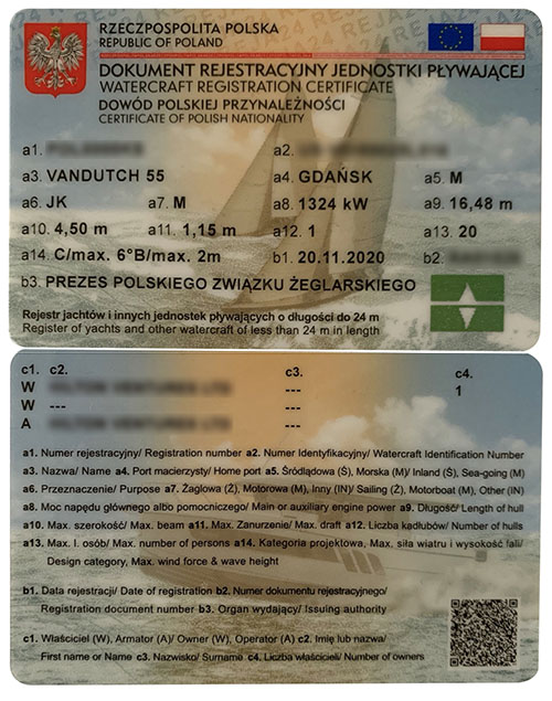 La documentación del barco con bandera polaca es una tarjeta plástica tamaño tarjeta de crédito, no tiene misterio alguno: