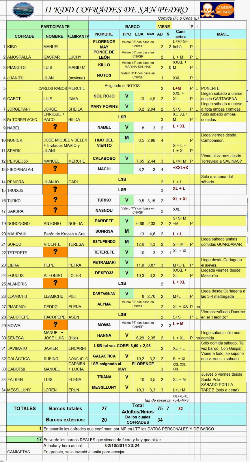Cabot..................2........0...... SOLROJO............13X4.5 Jorgepani.............2........0.......Mary Popins.........8,20 x 2,94 Sir-Torrelacho.......3.................LSB.... .......................................Sólo sábado Nonick y Spark.....4........0.......Hijo del Viento.....8,50 x 2,98.............Dos solo comida del sábado, dos KDD completa Perseo56.............3........0.......Calabob o............7,50 x 2,44 Firopinatar...........4........0.......Machi. .................8,20 x 3,00 Remora...............3........0.......Midingh y..............9,80 x 3,30 Truix65................1........0.......LSB....... ... .......... ???? Turko...................2........0.......Turko .................9,50 x 3,15 Amospallá............2........0.......Ponce de León.....con base en el club. Kibo.....................2........2.......Florence May.......con base en el club. Sakura.................3........0........NasNo u.............con base en el club Juanitu.................2....... 0.......NOTOS................con base en el club ALOPECAM............3........0.......CARCO........ .........con base en el club Nononono............2.........(0-2)..PARDETE...............6,88X2,33 Miahpaih..............2..........0......Sonrisa... .............13x4,60 Surco..................2..........0......Estupendo ............12,60x4,30 Equuus................1..........0.......Deseo33.. ..............10x3 Teterete...............2..........1.......Teterete ................9,50 x 3,23 Libra ...................3................Petra Mary.............11,91 x 387 Alandris................2.................LSB Llamichu...............2.................LSB en principio Pmarmol ............ 2 ó +....0........Alyma...............con base en el club Pacopepe.............2..........0.......Spit...... .................. 6,50x2,35 MOWA................2..........2(?)....MOWA....... ......con base en el club SENECA...............2...........0......HANNA..... ...................6.50x2.30 Javimatu..............2...........0......LSB...... .............................................Solo comida sábado Killo.....................2..........0...... Killo...............Con base en el otro club (que no empieza por P ......(rufianes) Galáctica..............2...........0.......Galácti ca.....................10,20 x 3,20 Carlos Ramos ........2...........0....... Es el médico-ponente, asignado al Notos. Cabot59....................3.........0..........LS B asignada a Florence May Falken ................. 2 ......... 0 .... Triana ....................... 10 x 3.5........ Arribamos viernes y nos apuntamos a todo MESSLLUNY..........3..........0..........Messlluny ..................10,3 x 3,3 ......sólo cena del sábado.... y domingo. Warlock35es..........2.........0...........LSB.... ......................................pagará el viernes en metálico BARCOS 26 (de los cuales 20 vienen de otros puertos) ADULTOS 78 NIÑOS 3-7