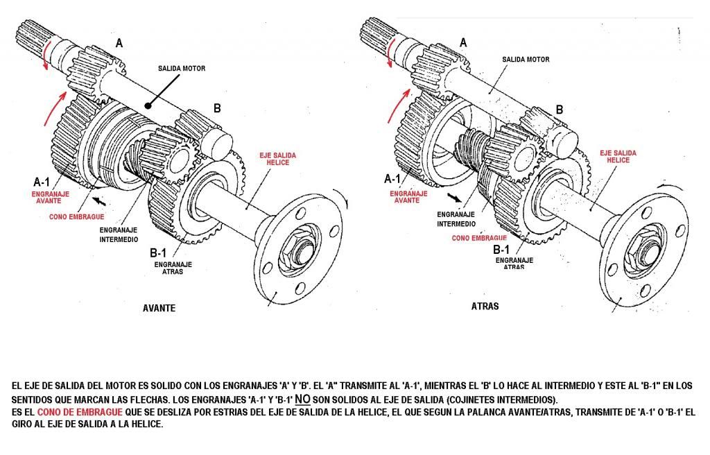 El esquema de la reductora me imagino que sería algo así: ![]() Con este esquema, dependiendo de los engranajes que se monten, imagino que no hay problema en conseguir la relación que se desee, tanto avante como atrás... La elección de distintas relaciones avante y atrás parece totalmente deliberada y la explicación CREO que es que al girar más despacio el eje atrás que avante, con el mismo paso en vez de mayor como le correspondería, el motor va más ligero y se puede (debe) subir más de vueltas y obtener más potencia, aparte de que al tener más revoluciones, el efecto centrífugo es mayor y se evita que la hélice se cierre por el empuje que ejerce hacia proa. Gracias por la ayuda.. ![]()