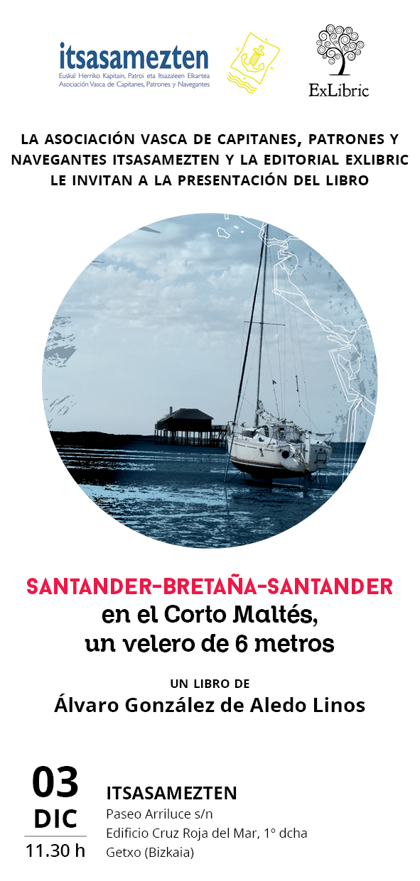 Hola navegantes. La Asociación Vasca de Capitanes, Patrones y Navegantes ITSASAMEZTEN me ha invitado a presentar el libro en Euskadi, concretamente en Getxo. Un sitio muy oportuno por la extraordinaria acogida que siempre nos han dado, tanto en el viaje a Bretaña como en el de este verano a la Isla de Elba cuando tuvimos que reparar allí el accidente en el casco del Corto Maltés con el remolque. En el libro “Santander-Bretaña-Santander en el Corto Maltés, un velero de 6 metros” cuento la navegación que durante 3 meses realizamos en el verano de 2015 a Bretaña, llena de anécdotas y de sitios maravillosos y poco conocidos, y en la que nos metimos además por cuatro ríos de la fachada atlántica de Francia. Será fácil deducir que no hace falta tener un barco grande para realizar largas y magníficas navegaciones. Será en el edificio de la Cruz Roja del Mar (Calle Arriluce s/n), junto al puerto de Getxo, el sábado 3 de diciembre a las 11:30. Me encantaría que pudierais acudir, y si queréis que me ayudeis a difundirlo reenviándoselo a vuestros contactos que pudieran estar interesados en la navegación y los viajes de aventura. La imagen que sigue puede reenviarse por wasap. Gracias.