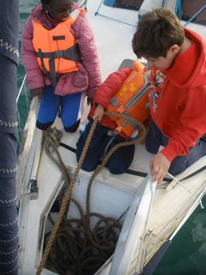 Hola navegantes. Ayer fue nuestra décima navegación este verano con los grumetillos y la dedicamos a enseñarles a pescar. Este día les embarcamos en una motora con un pescador que sepa pescar, no como los de los veleros que hacemos como que pescamos, para que se diviertan y aprendan algo de verdad, estando garantizadas las capturas. Embarcaron en el "Cole", que ayer sí que parecía de verdad un cole, aunque para aprender otras cosas. Aprendieron a insertar los gusanos en el anzuelo, a recoger el pescado y a limpiarlo. Pescaron medio caldero, sobre todo de julias: Nos acompañó Carmen, una bióloga experta en oceanografía, que les enseñó a diseccionar las piezas y les enseñó cómo son los peces por dentro, además de a medirlos con el ictiómetro: A media tarde intercambiamos las tripulaciones con las de los veleros, que también habíamos salido, para que todos tuvieran oportunidad de aprender a pescar: Yo me cogí a las dos más pequeñas, que como el día estaba nublado enseguida se quedaron frías y tuvimos que disfrazarlas de "fantasmas" (son sus percepciones y sus palabras): A última hora quedamos todos en el Cole para ver la pesca del día y repartirla, para que todos se llevaran la cena: Al llegar a puerto todavía nos dio tiempo a enseñarles otra pesca", la de los cangrejos: Y esta vez la lluvia nos respetó, porque sólo se puso a tronar y a llover cuando ya habíamos amarrado en puerto. Y encima nos vinieron los Reyes Magos, porque una de las grumetillas que tiene huerta nos trajo un regalazo a cada uno, un lote de productos de su huerta de varios kilos de peso, que tuvimos que repartir debajo de la mampara de la parada del autobús porque ya llovía. ¡Con cuidado, navegantes!.