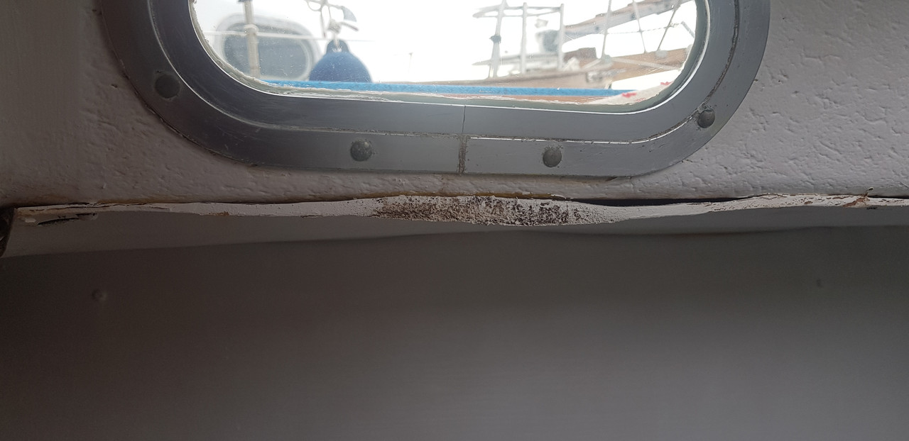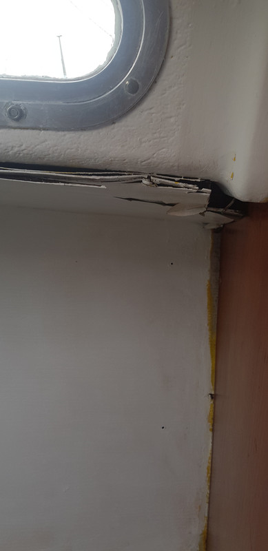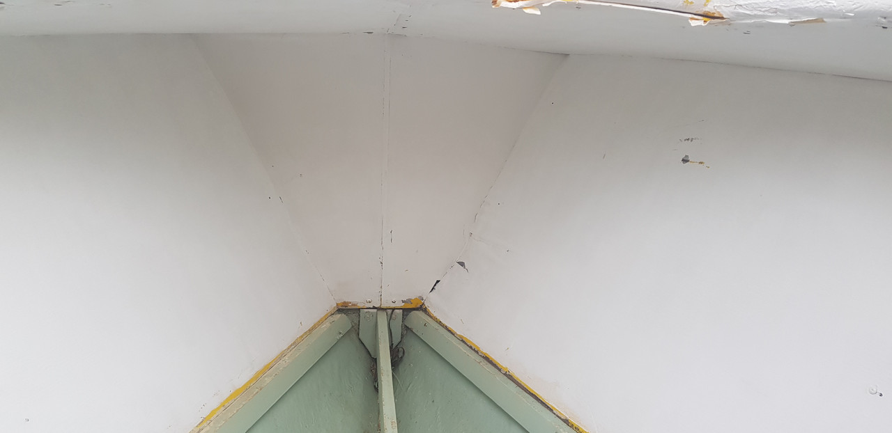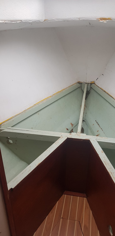 Ahora le tocaba el turno al camarote de proa y el baño. Del baño y sus bricos no tengo ninguna foto, a veces me pongo a trabajar y no recuerdo hacer fotos del antes y del después. Tengo mogollón de chapucillas hechas por el barco sin fotografiar. Pero vamos con el camarote de proa que es lo que toca. Cuando lo vi por primera vez estaba así. Sin duda a su anterior dueño le gustaba el color amarillo. ![]() Después, lo pinto blanco, una manecilla de pintura de aquella manera. Observar, los perfiles y terminaciones estaban hechas polvo, muchas partes de los tableros que cubren el techo se habían levantado. ![]() ![]() ![]()