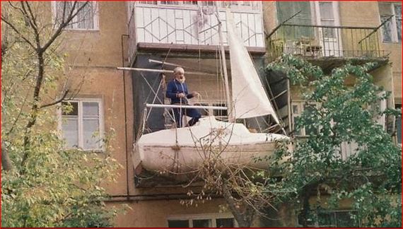 Nada más volver, Yevgeny empezó a soñar en una segunda circunnavegación. Pero no teniendo espónsor y con su jubilación miserable, sólo le quedaba la opción de construirse él mismo el barco. Ya sabéis que la distancia entre tu sueño y la realidad se llama disciplina, y de esa le sobraba a Yevgeny. Carente de medios para alquilar una nave donde construirlo, sólo disponía del balcón de su apartamento, que medía 3,7 metros, y eso definió la eslora de su barco. Lo construyó allí mismo, en su balcón.