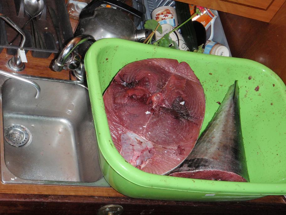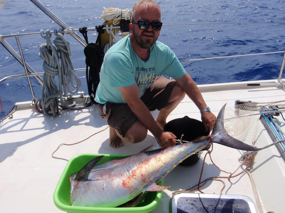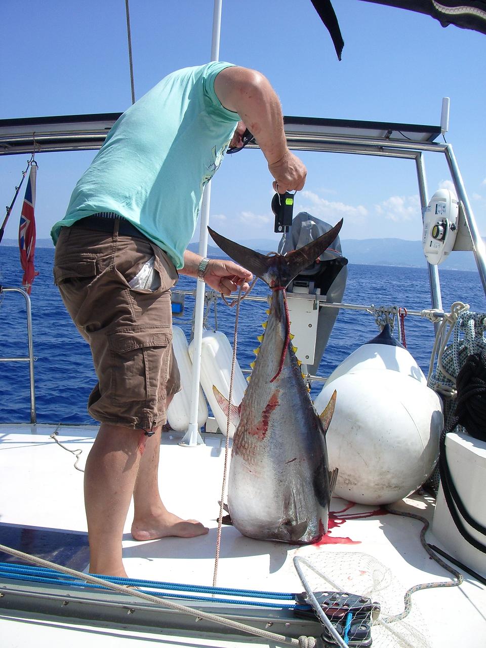 Ya estaba lo más difícil... o eso pensaba yo; el bicho coleteaba un montón y teníamos miedo de perderlo; le atamos un cabo alrededor de la cola y lo fijamos al barco. Después nos han dado mil recetas para acabar con la vida de un atún peleón rápido (que si verter ron en las agallas, que si un martillazo en la nuca) pero para entonces no sabíamos más método que el cuchillo y dejarlo sin cabeza. Buff, menuda sangría líamos (os acordáis que nuestros pasajeros eran firmes opositores del sufrimiento animal... pues ya os los podéis imaginar)