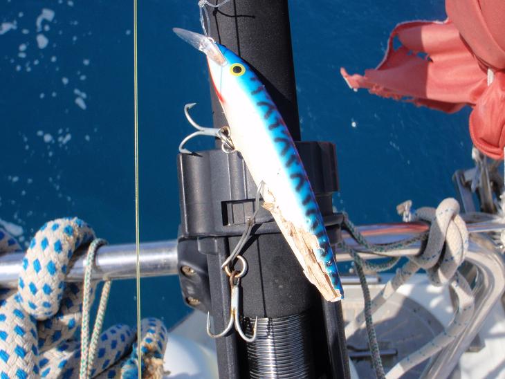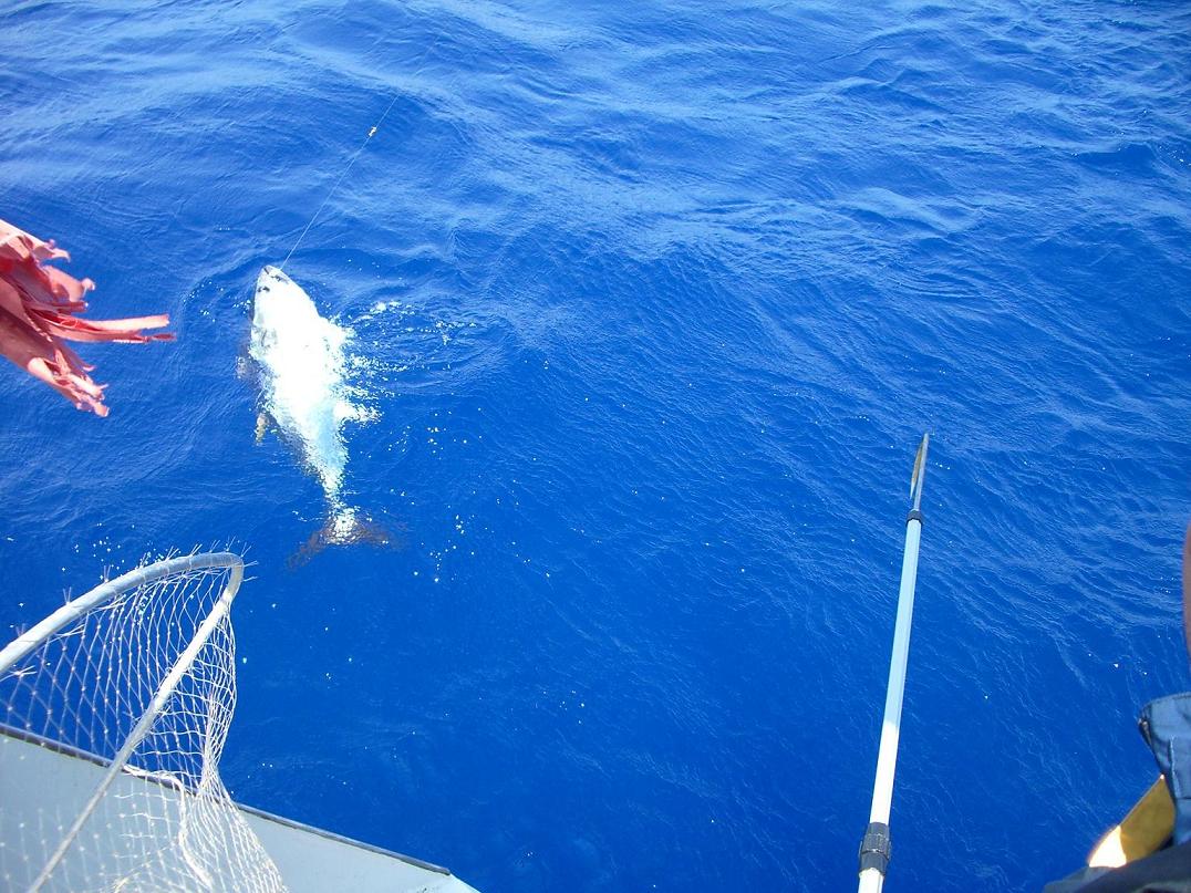 Yo había preparado nuestra red y cuando vi al bicho me quedó claro que no servía de nada y busqué el garfio pero de repente me dí cuenta de que había dos chicos a bordo y pedí si alguno quería ayudar a subir la pieza. Para mi mala suerte eran ¡vegetarianos! convencidos y definitivamente contrarios a cualquier sufrimiento animal. Uno de ellos dijo que no contáramos con él -y nos encantó la coherencia de su postura- y el otro haciendo tripas corazón se puso el chaleco que le ofrecíamos -por si el bicho lo mandaba al agua-, la línea de vida...
