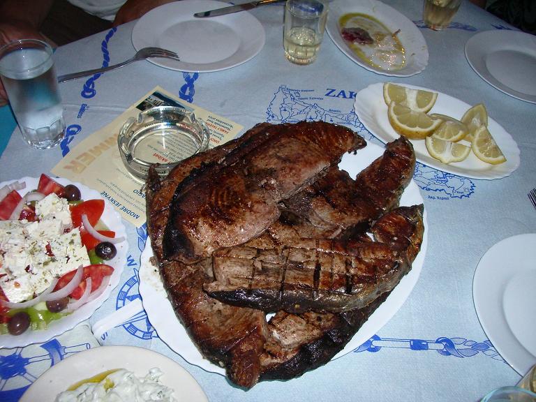 Ya habíamos decidido regalar lo que no pudiéramos conservar al restaurante de Dimitri; no disponíamos de tiempo ni utensilios para empezar a hacer conserva así que nos pareció una buena solución. Dimitri se ofreció a trocearlo por nosotros, a prepararlo de modo que nos pudiéramos quedar con más parte, pero acordamos que simplemente nos cocinara una ración generosa para la cena (nos invitó a las ensaladas y el vino) y todos tan amigos