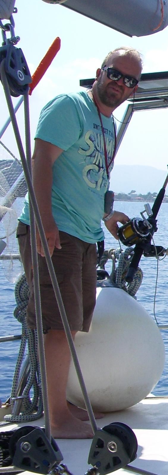 Yo había preparado nuestra red y cuando vi al bicho me quedó claro que no servía de nada y busqué el garfio pero de repente me dí cuenta de que había dos chicos a bordo y pedí si alguno quería ayudar a subir la pieza. Para mi mala suerte eran ¡vegetarianos! convencidos y definitivamente contrarios a cualquier sufrimiento animal. Uno de ellos dijo que no contáramos con él -y nos encantó la coherencia de su postura- y el otro haciendo tripas corazón se puso el chaleco que le ofrecíamos -por si el bicho lo mandaba al agua-, la línea de vida...