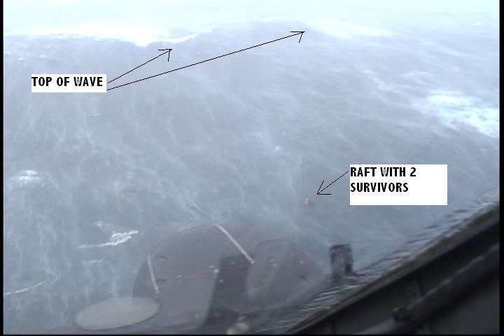 La imagen adjunta corresponde al relato, se ve la magnitud de las olas atlanticas obtenida desde el helicoptero del guardacostas a cierta altura, las crestas y el diminuto punto de la balsa con los supervivientes te hace suponer la impotencia que tienes que tener observando en la superficie del oceano semejantes olas.