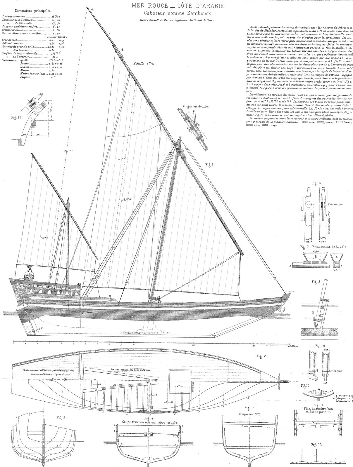 No será una faluca? O un "dhow" ? Me llama la atención en los planos que la dos Latinas son aparejos "místicos", es decir, no hay pico de car, sino que la vela a proa acaba en un corte vertical (lo que facilita la virada), que el palo de la mayor va centrado e inclinado a proa ("a la catalana", expresión que de hecho seguramente es un anacronismo, ya que en el Mar Rojo se navegaba "a la Catalana" mucho antes que en la Costa Brava) , y que la mayor no llega a la pena... debe ser un aparejo de invierno, ya que pierde una considerable superficie vélica donde ésta es más eficaz (en lo alto), pero veo al ampliar al plano que lo que hace es indicar tres posibilidades de vela mayor, con más de 116m2 de diferencia...