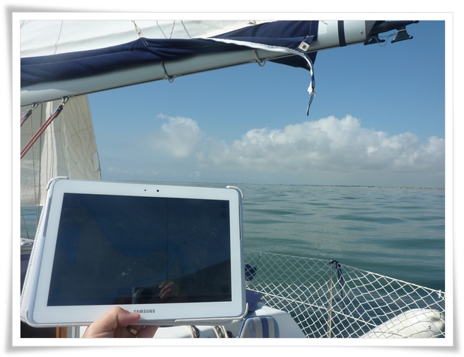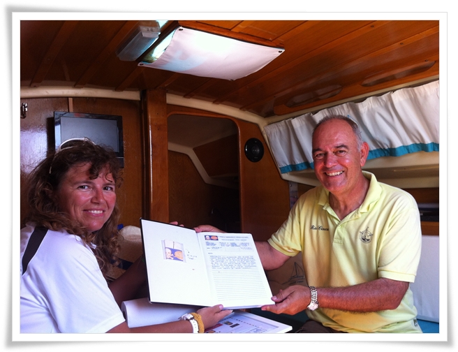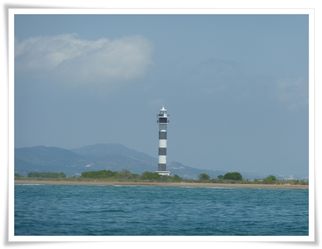La verdad que no puedo estar más que agradecida a que el PAÑUELO haya estado unos cuantos años parado, porque ha sido la forma de que YO pudiera formar parte de esta historia tan chula, ya que aunque cuando empezó la regata yo ya pululaba por esta Taberna, ni tenía barco ni imaginaba que tendria un velero que tantas satisfacciones me daría, asi que, por o que a mi respecta... ESTOY ENCANTADA Puedo decir que estaba realmente emocionada... Hacer de nuevo el traspaso del pañuelo era un punto, pero hacerlo NAVEGANDO, en un recorrido TOTAL DEL DELTA (De la Ampolla a Las Casas) y nada menos que con Río Cinca, el gurú del Delta, que tantos consejos me ha dado de esta zona y a quien todos agradecemos sus waiypoints fantásticos, no era para menos!!! Como ya han relatado, la travesía fue de lo más tranquila... hubiera deseado un poco más de viento, para aprender de la experiencia y disfrutar en un gran barco como este, pero Meteo decidió, que sin ser una calma chicha, tuvieramos la tranquiliad absoluta de disfrutar cada tramo de este Delta y de la buena conversación con un día precioso. (De todas formas... alguna emoción sí que hubo, si... pero es que no se trata de contarlo todo Primer tramo del Delta, saliendo desde la Ampolla. Ahí enfrente está la desembocadura del Ebro, aunque no se ve todo lo que quisieramos... La llegada a las Casas fue clavada a la hora prevista, y allí se hicieron las presentaciones entre el Kivuca y Rio Cinca, con el traspaso del gran tesoro tan deseado. La verdad he de decir que se notaba por todos los poros como este Pañuelo tenía un significado importante para Rio Cinca, así que me siento más que orgullosa de haber sido yo quien se lo pasara a él. No pudo ser mejor día para hacerlo, ya que en Alcanar se celebraban las Jornadas del Llangostí, así que no os cuento cómo nos pusimos de idems en una variada demostración gastronómica... Aún me sorprendo de cómo volvimos navegando!! Tras los postres y el café procedimos al momento central de la Regata del Pañuelo, la firma de los presentes!! Pasamos un rato realmente agradable en la comida, y con la panza llena y el Pañuelo en poder de Rio Cinca podíamos continuar la travesía con la satisfacción de haber cumplido una misión y la felicidad de ser ahora el custodio del Pañuelo... Soltamos amarras del pequeño y coqueto puerto del mediterráneo ÚNICO PUNTO DEL DELTA DONDE RIO CINCA NO HABÍA ATRACADO ANTES así que quedan para la historia estas imágenes: (El que Rio Cinca, como muchos otros no hubiera parado aquí es porque se mete mucho miedo con este puertecito, que sí, es mínimo, pero ya veís que no hay problema: en el muelle de pescadores hay calado suficiente (4 m) y permite desembacar en uno de los pocos lugares de este Mediterráneo nuestro que conserva todavía la magia de un pueblito de pescadores, sin casas de más de 4 pisos, sin hoteles, sin turismo de masas, y donde se come excepcionalmente. Todos los que van, prometen volver, y ahí me tenéis, los conocidos y los que nos tenemos que conocer, para lo que haga falta. Desde la popa, ya dejando atrás Alcanar y casi llegando al Delta de nuevo, se ver preciosa la orografía de la zona... La montaña del fondo es el Montsiá, la gran barrera natural de la zona, que protegida entre ésta por tierra, y el Delta por mar hace que sea un sitio casi que con un "microclima" especial!! Estaba tan contenta que quitamos el piloto y me agarré a la rueda con verdaderas ganas... es todo un honor que un gran navegante diga esto de una absoluta novata de la vela, Cita: