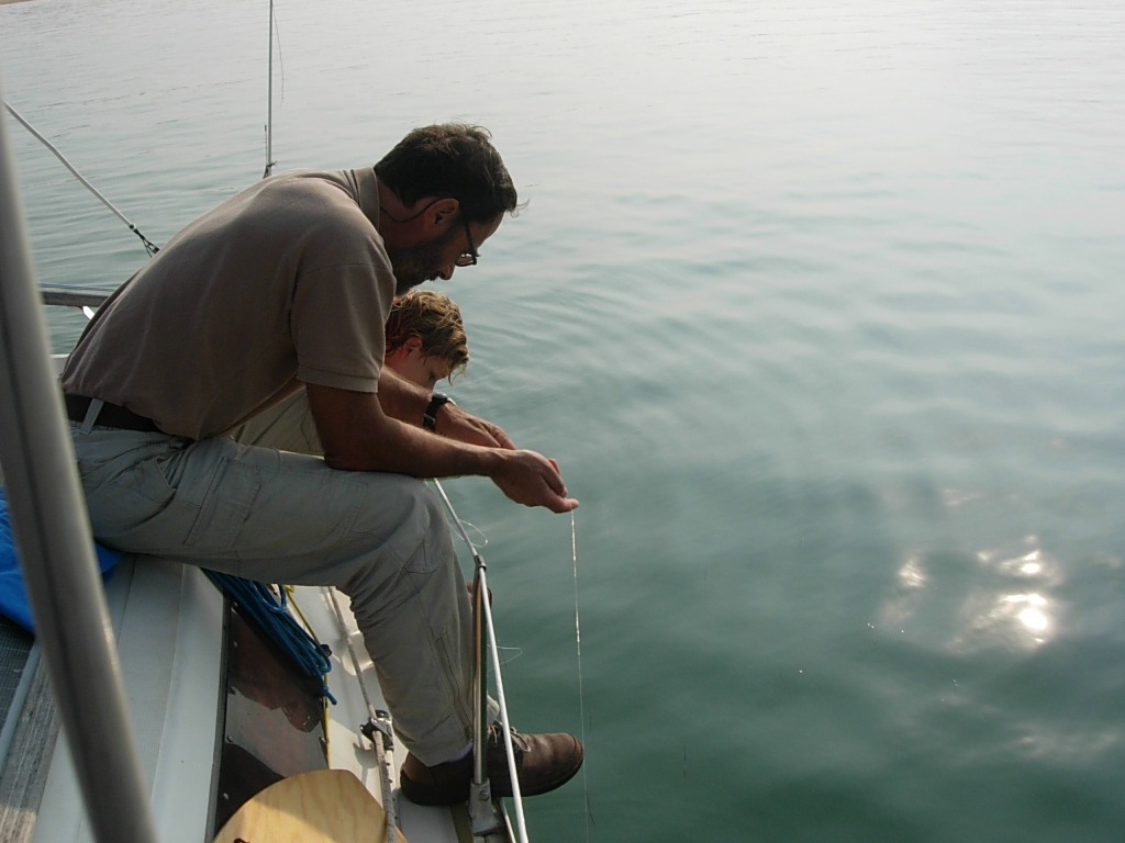 Como seguíamos sin viento, dedicamos la mañana a intentar pescar, pero no cayó nada aunque había un banco de peces a la sombra del Corto Maltés pasando el día. Como no llevábamos cebo lo intentamos con salchichón, y se ve que no les gusta.