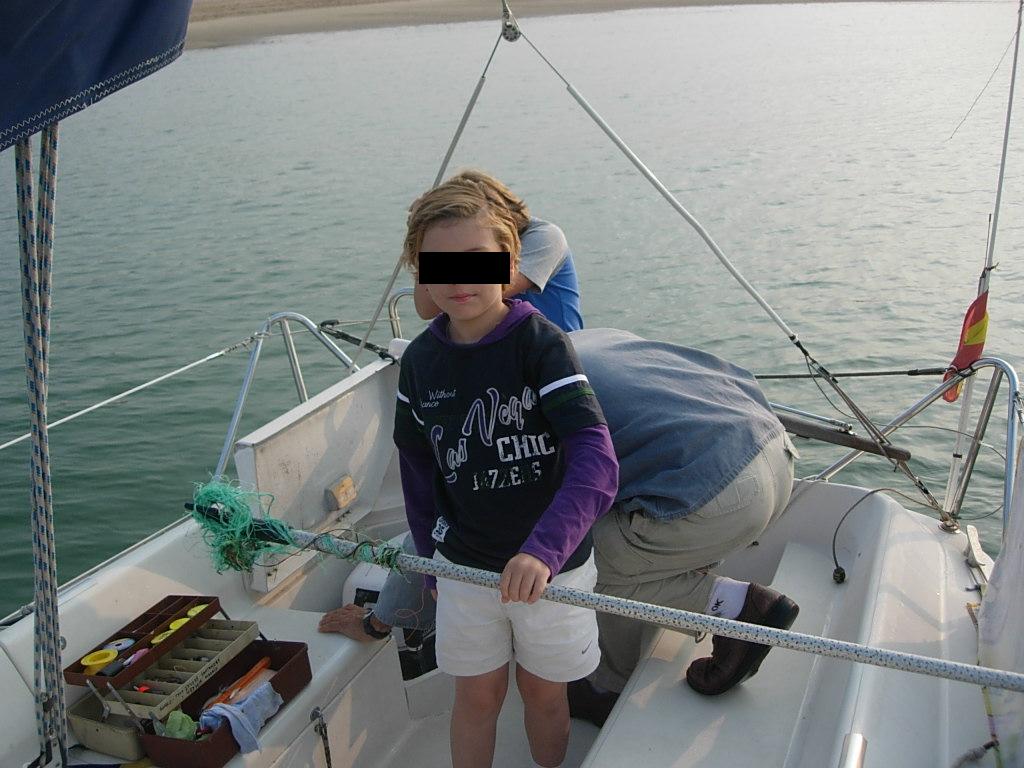 La tarde terminó lloviendo y nos volvimos a puerto un poco antes de tiempo. En el pantalán, entre un chubasco y otro nos dió tiempo a enseñarles a pescar cangrejos.