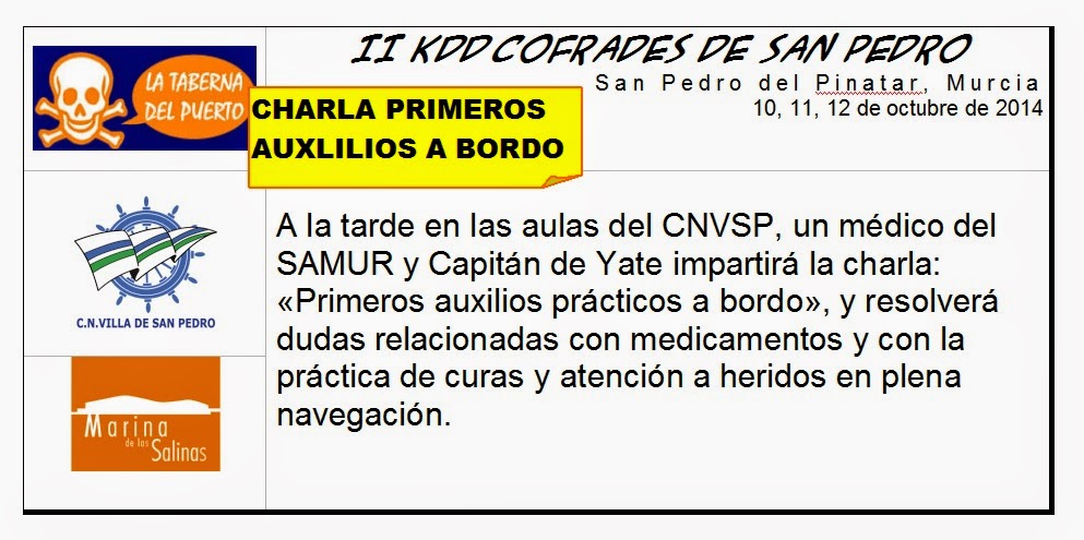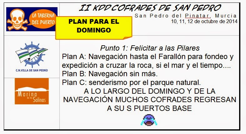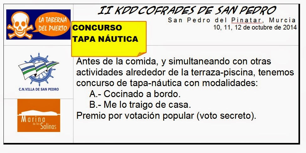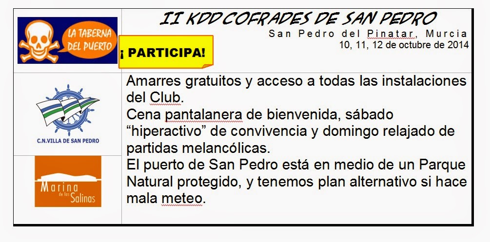 Sería un descanso organizativo y lo agradecerían los Clubes y los CEOs (no te digo ná los conserjes como yo). Además, se ha hablado que la Pinataerense se haga una vez en CNVSP (CLUB NÁUTICO VILLA SAN PEDRO) y otra vez en Marina Salinas. Y así hermanamos la Cofradía del Norte, que en el Mojón no hay puerto y el Pilar ya es «terra incógnita» ![]() ![]() ![]() ![]() ![]() ![]() ![]() ![]() ![]()
