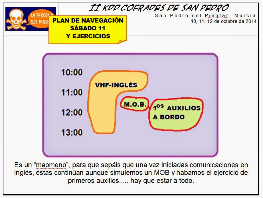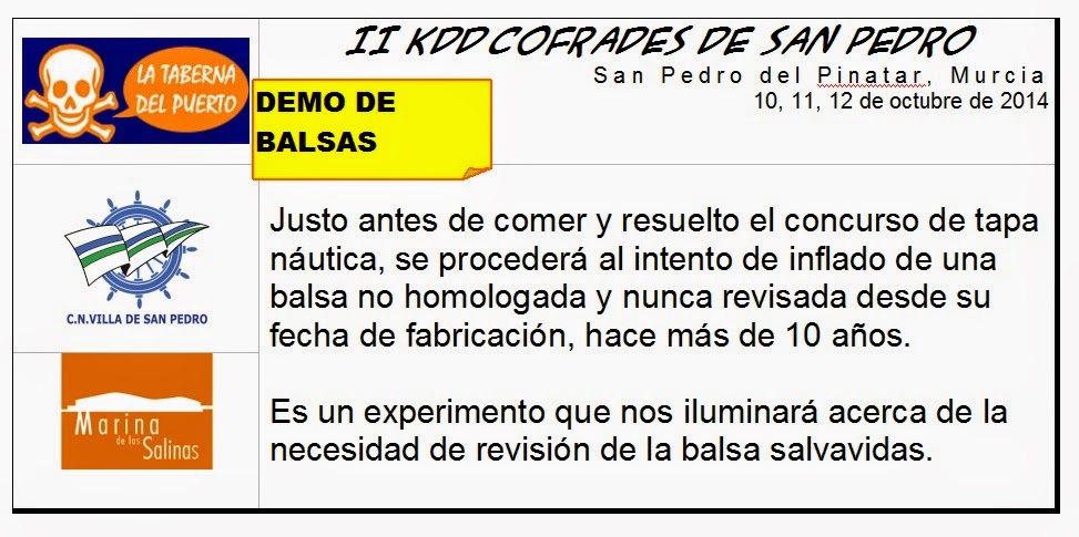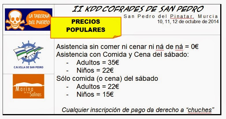 ![]() Con la venia, Reunido el Consejo de Administración y confirmados los detalles de última hora se procede a elevar a definitivo el último borrador de programa y se autoriza al cofrade Juanitu a publicar el precio oficial de la cosa Ahí va eso: ![]() NO, NO ES BROMA 35€ INCLUYE TODO: Amarres y servicios, Ejercicios de navegación, Comida del sábado, Charla Primeros Auxilios, Cena del Sábado, y bolsas de regalitos promocionales, incluyendo una camiseta de la KDD y unas gafas de sol uv400 con cinta flotante. ![]() (Y ahora voy a publicar los menús y se os caerá el escafurcio a la sentina...)