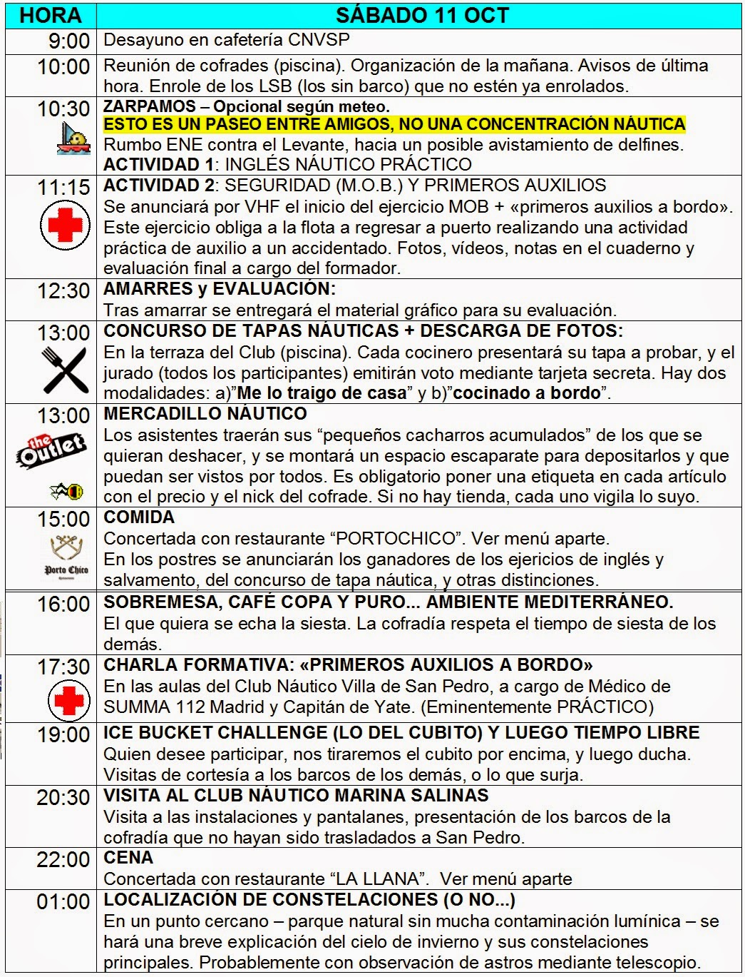 Se aclara que no es una "concentración náutica" porque - de hecho no lo es - así evitamos tener que "dar parte" a Capitanía, solicitar permiso para realizar actividades competitivas, y contar con un "responsable de seguridad", algo obligado por ley para las regatas, las exposiciones náuticas con navegación organizada, y las "concentraciones náuticas" como la procesión de la Virgen del Carmen. En realidad NO SOMOS CONCENTRACIÓN porque las actividades tienen lugar en el puerto, y la salida del sábado es opcional, no competitiva, entre amigos y es una navegación libre sin un fin concreto, ya que la actividad formativa se hace por radio - incluso se podría seguir la actividad desde el puerto- Pozezo. ![]()