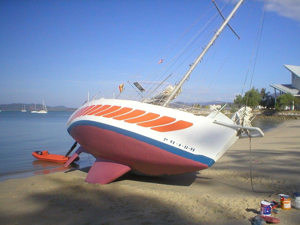 Verás que aún están los botes de pintura en la playa y la parte apoyada sin pintar, seguramente pinté lo más rápido posible la parte baja para que tuviera el mayor tiempo de secado y acabé la parte que está por encima de flotación después de la foto.