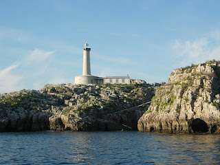 Eso es, después de la mojadura de la navegación anterior ayer volvimos a salir con los grumetillos y todo lo que la anterior tuvo de malo, lo tuvo la de ayer de bueno. Hizo una tarde veraniega. Al principio estuvimos dudando si desembarcar en la Isla de Mouro porque hacía un viento del Norte al Noroeste que no es el ideal para ello. Con ese viento el fondeadero frente a la ensenada de La Raposa está expuesto al viento, y como el fondo es muy profundo los barcos pueden garrear. El viento ideal es el del Nordeste, que deja esa ensanada al socaire de los altos acantilados de la isla, de más de 30 metros de altura donde rompen las olas del Cantábrico con fuerza. Pero nos decidimos y no erramos el tiro. Aquí la aproximación a la isla: De más cerca vimos la típica silueta de Bart Simpson que caracteriza la isla: Estuvimos estudiando el anidamiento de la gaviota patiamarilla. Conviene desembarcar con gorra, porque los adultos protegen a sus crías haciendo vuelos rasantes y defecándote encima. Los nidos los construyen con todo tipo de materiales, y los hacen en el mismo suelo, ya que en esa isla no tienen depredadores. Cada pareja pone tres huevos del tamaño de los de gallina, pero de color marrón moteado. Desembarcamos en varios viajes. Una vez en la isla cada grupo que ha venido en un barco queda a cargo del adulto que ha navegado con ellos. Mouro tiene unos acantilados y grietas peligrosos, y hay que vigilar mucho los movimientos de los niños. Entonces nos dedicamos a la exploración de los nidos y los polluelos. Les enseñamos las patas palmeadas, el pico que no hace daño si te coge un dedo, las cañas de las alas y las plumas, el latido de su corazón a toda velocidad, la temperatura cálida a la que los mantiene la madre aunque ese día haga frío, etc. Los polluelos alcanzan el tamaño de una gallina pequeña y son un poco guarretes, pues cuando les coges (a veces tras una divertida persecución, porque como todavía no saben volar sólo corren por el suelo) se cagan encima o te regurgitan lo último que han comido, por eso a los niños les ponemos guantes. Las regurgitaciones sirven para ver de qué se alimentan, pues suelen echar trocitos de pescado. Dimos una vuelta en torno al faro, ya cerrado pues es automático, y vimos las espectaculares vistas desde lo alto, con nuestros barquitos al fondo. El faro se inauguró en 1858 y estaba al cuidado de dos torreros, ahora está automatizado desde hace años; es de color blanco y su silueta domina el horizonte desde toda la fachada Nordeste de la ciudad y las playas del Sardinero. Recorrimos la meseta que hay en la cumbre de la isla, cubierta con un espeso manto vegetal de hinojos y geranios marinos que crecen entre las grietas de la roca. De este manto vegetal cogen las gaviotas la materia prima para sus nidos. Luego nos fuimnos a fondear a Los Peligros para merendar y bañarnos. Con tantas emociones se nos hizo tarde y volvimos a puerto a motor, aprovechando para repasar los nudos que aprendimos la semana pasada bajo la lluvia. Una tarde perfecta.