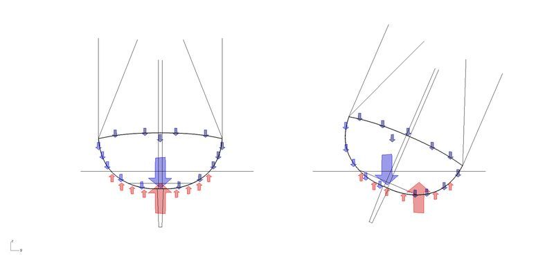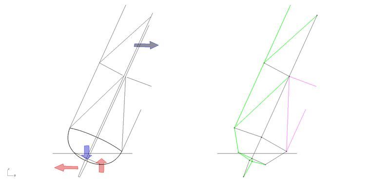 De este esquema vemos que la tensión de los obenques es la que transmite la mayor parte de la fuerza y debe hacerlo hasta la base del mástil, que trabaja a una fuertr compresión. La quilla transmite el esfuerzo lateral a la varenga, elemento de gran importancia, y la presión hidrostática del casco se debe transmitir también de toda la superficie del casco a la base del palo a través de la estructura de cuadernas y varengas.