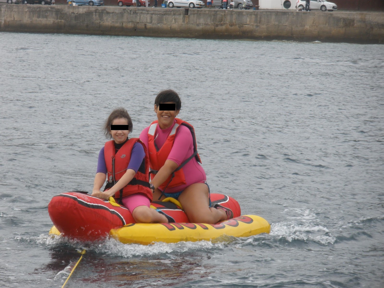 El sábado pasado fuimos con los grumetillos a hacer "churrito", una especie de arrastre en paipo o de jet-esquí con un inflable. Fue una pequeña sorpresa inesperada, al poder disponer a última hora del inflable y de una motora que lo arrastrara. Hizo una tarde nublada pero con muy buena temperatura y pocas olas, extraordinaria para lo que pretendíamos. Fui a buscarles con el churrito a donde estaban fondeados los veleros a la hora de merendar, y terminamos la tarde con esta novedad.