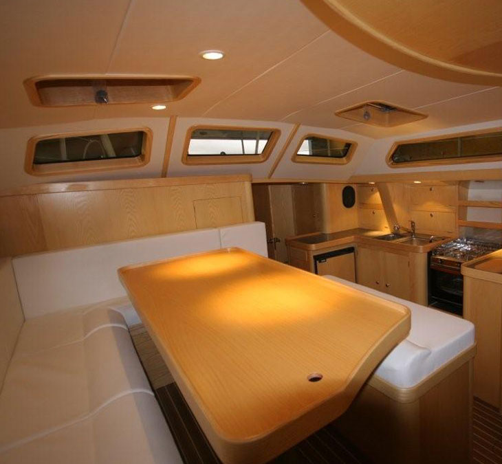 Bueno amigo Prometeo, muy fina no es, esa moldura que se ve a la derecha no debería estar así con el canto visto y lo de las mayas tampoco queda muy elegante, pero no te ofusques y no compares con los Jeanneau, etc ... porque ya no llevan madera ni tablero chapado ...
