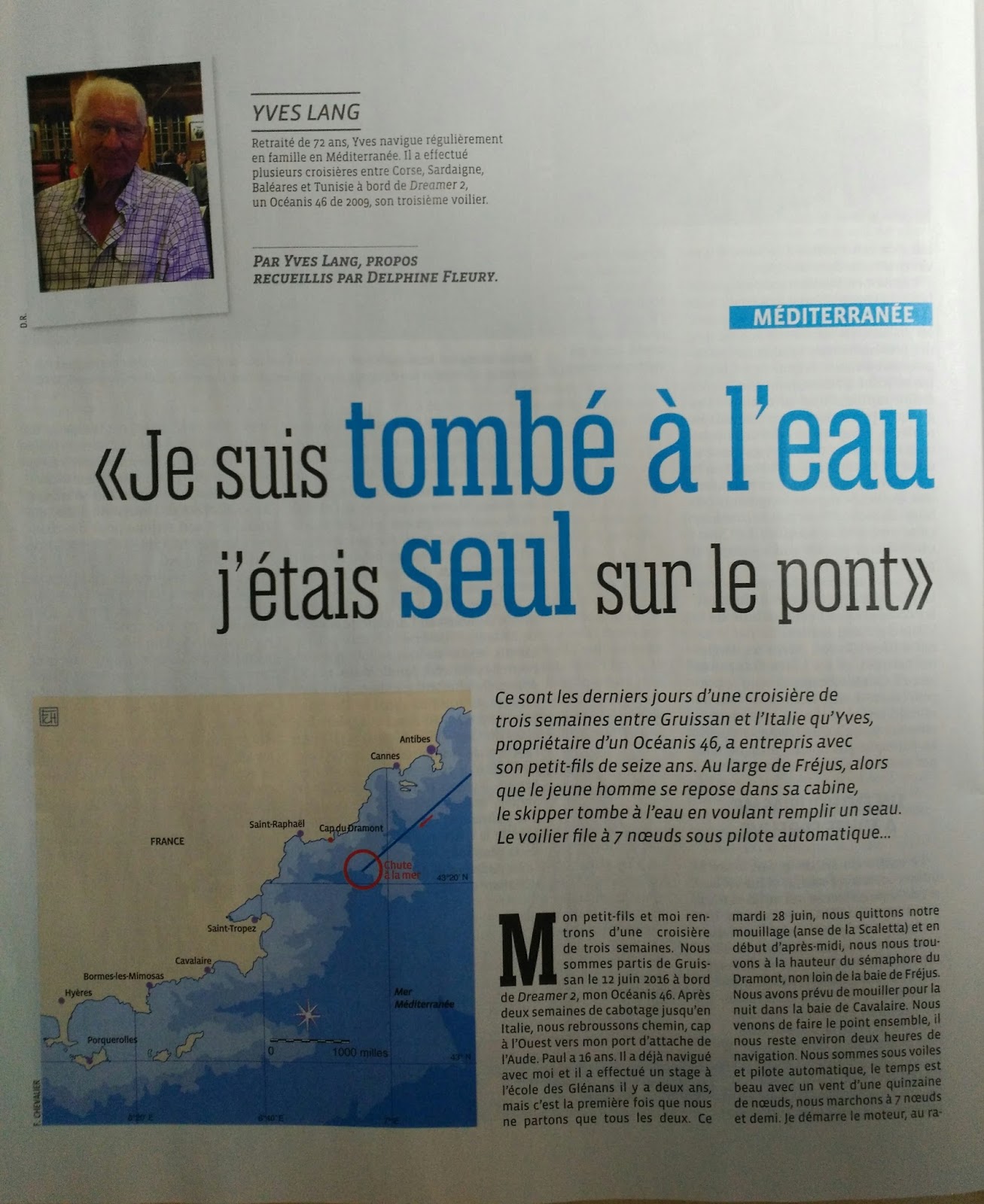 Volviendo de la isla de Elba en el Corto Maltés, a la altura del Golfo de Saint Tropez vivimos de cerca las desventuras de un hombre al agua. Ocurrió el 28 de junio y lo conté en la entrada del blog del 29 de junio. Era un hombre que se cayó, sin chaleco, al coger agua con un cubo, que le arrastró. Se lo había atado a la muñeca para no perder el cubo, y casi pierde la vida. Pues ahora ha contado su desventura en el número de enero de la revista Voiles et Voiliers, que os reproduzco para los que sepáis francés.