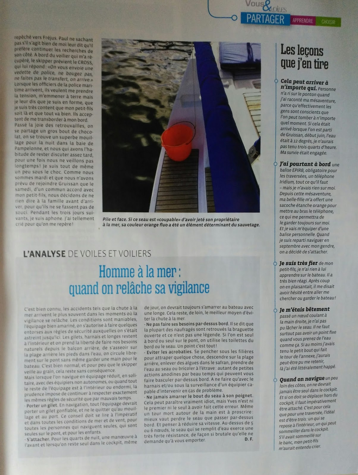 Volviendo de la isla de Elba en el Corto Maltés, a la altura del Golfo de Saint Tropez vivimos de cerca las desventuras de un hombre al agua. Ocurrió el 28 de junio y lo conté en la entrada del blog del 29 de junio. Era un hombre que se cayó, sin chaleco, al coger agua con un cubo, que le arrastró. Se lo había atado a la muñeca para no perder el cubo, y casi pierde la vida. Pues ahora ha contado su desventura en el número de enero de la revista Voiles et Voiliers, que os reproduzco para los que sepáis francés.
