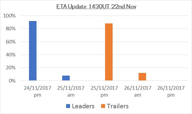Los primeros al ritmo que llevan yo creo que llegan el viernes 24, les quedarán unas 800 millas a Ciudad del Cabo y están haciendo promedios diarios por encima de las 500 millas