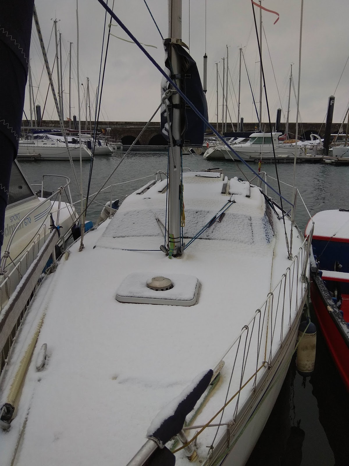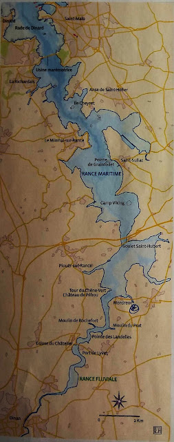 Hola navegantes. Es La Rance, otro de los sitios míticos de la vuelta a Francia y de los más curiosos por los que se puede navegar. Es un enorme río (1 km en su desembocadura) al que se ha cerrado con una presa, como el Vilaine que conocimos en nuestra anterior navegación a Bretaña. Como comparación, el Vilaine tiene en su desembocadura "sólo" 500 metros. Pero así como en el Vilaine es una presa hidroeléctrica (embalsa el agua y la deja caer en una sola dirección) en La Rance es una presa mareomotriz, o sea, utiliza la fuerza de la marea al subir y al bajar, y por lo tanto la represa se llena y se vacía. Hay una esclusa que te permite pasar a aguas arriba de la presa, y allí te encuentras en un mundo raro, tirando a rarísimo. Por lo pronto la marea, mediatizada por la presa y las necesidades energéticas, está modificada respecto a su ritmo natural. Se ha creado un régimen de mareas artificial cuya amplitud puede ser desde 4 hasta 12,5 metros en vertical, y eso de un día para el siguiente. Los horarios de mareas y su altura se dan a conocer cada viernes para la semana siguiente y hay que consultarlos en un teléfono o una web. La luna es más predecible. Y esos horarios y alturas son importantísimos, pues definen las horas a las que se puede entrar y salir de los puertos, que son de los que se secan en bajamar, y lo más importante, te avisan de lo que puede pasar si varas en una orilla. En las mareas naturales es predecible, sabes qué día podrás volver a reflotar según la marea (normalmente en la siguiente pleamar) pero aquí te arriesgas a quedarte en seco varios días hasta que ese ritmo artificioso te facilite el agua necesaria para reflotar. A un barco como el Corto Maltés, con orza abatible, le pasó y se quedó varado tres días, pero nada impide que sean varias semanas, porque obviamente no van a modificar la marea y su plan energético para que un velero desencalle. En esta primera parte de La Rance el agua es salada y se llama "La Rance Marítima". Por si fuera poco, a mitad del recorrido del río hay otra presa con esclusa, esta vez cerrada, por la que se accede a la parte "fluvial" de La Rance, que es de agua dulce. Allí no hay mareas y se navega como en cualquier canal. Tanto en la parte marítima como en la fluvial hay varios puertos, el último de la parte fluvial en pleno centro de la ciudad medieval de Dinan. Y para mayor interés, en La Rance marítima vive una foca, Josefina, desde hace 17 años. Supongo que entró en uno de los pasos de barcos por la esclusa de la presa mareomotriz, y ahora cualquiera se atreve a volver al mar por esa infraestructura, que si te absorbe te hace carne picada en las turbinas. Así que allí estará la foca hasta la edad de la dependencia, y mientras se ha hecho una vecina más del puerto de Mordreux. Se la suele ver tomando el sol entre los bañistas en la rampa. Además se ha visto a jabalíes cruzando el río de una orilla a otra, pues allí ya sólo mide veintitantos metros de ancho. Como veis, hay sitios muy interesantes para navegar sin tener que dar la vuelta al mundo y tener un superbarco. De hecho los de quilla fija lo tienen muy difícil para navegar por La Rance, cuya parte marítima se seca prácticamente en bajamar, y los de más de dos metros de calado lo tienen imposible, pues es el calado mínimo de los puertos del interior.