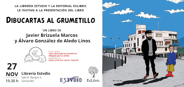 Hola navegantes. Ayer presentamos Javier y yo el libro "Dibucartas al grumetillo" en la librería Estvdio, de Santander, y ya se puede comprar por internet a través de la columna derecha de mi blog. Ya os dije que todos los beneficios, TODOS, incluso los de la editorial, van a la lucha contra el cáncer infantil. Como esta vez yo no gano nada puedo pediros sin vergüenza que seáis generosos y nos ayudeis a difundirlo. Es un buen regalo de Navidad para cualquiera que tenga niños y quiera educarles con algún valor diferente de los de las videoconsolas. ¡Salud y poesía!.