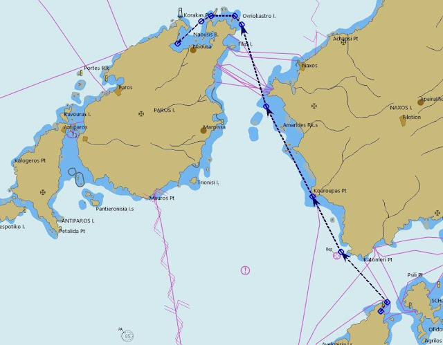 16 millas que hacemos a vela con solo la génova impulsados por viento del norte, bordeando la pequeña isla de Pserimos. Especial atención a la punta norte de la isla donde hay un bajo mal señalizado, poniendo especial atención a no entrar en aguas jurisdicionales de Turquía, La distancia es de poco mas de dos millas y se pasa a menos de media milla de la linea divisoria.
