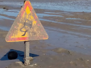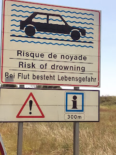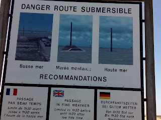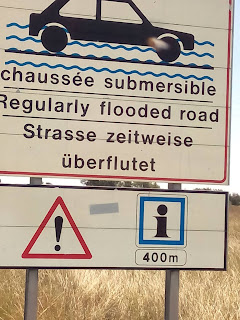 Mi sobrina Alicia y yo fuimos a conocerlo con las bicis y nos tuvimos que hacer 25 kilómetros a primera hora de la mañana, para llegar con la bajamar. En los últimos kilómetros fuimos viendo algunos carteles de tráfico que nos iban poniendo en situación, y no debe haberlos en muchas partes del mundo. Se veía un coche con el agua por el capó que decía “Peligro. Calzada sumergible”, y cien metros más adelante el agua ya había tapado al coche y decía “Riesgo de ahogo”.