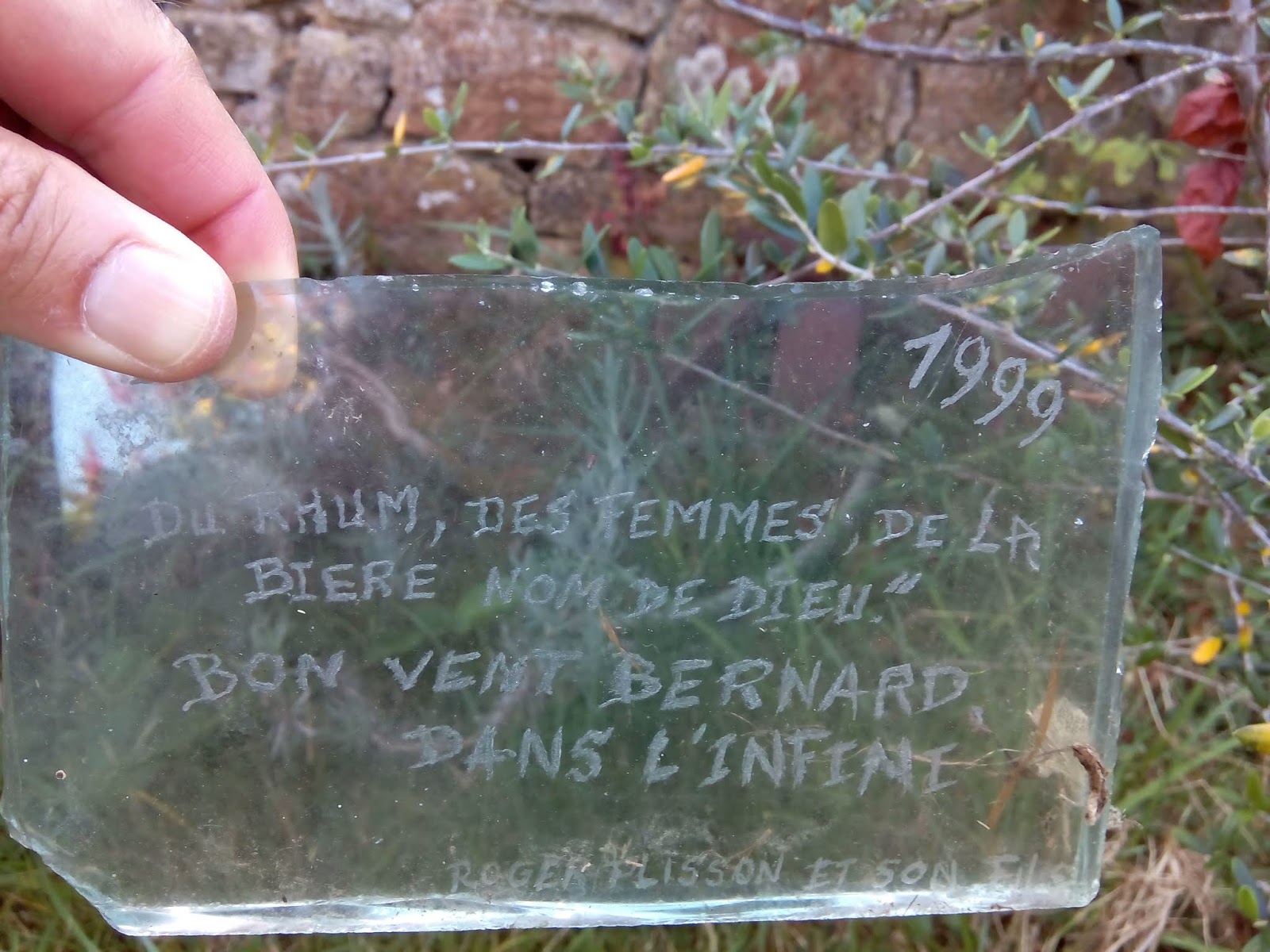 Un cristal con el canto roto y grabado a mano decía: "Ron, mujeres y cerveza, ¡en nombre de Dios!. Buenos vientos, Bernard, en el infinito. Roger Plisson y su hijo”. Un recuerdo emocionante, sobre todo si te imaginabas al padre y al hijo eligiendo el texto y grabándolo con una navaja en un cacho de cristal: