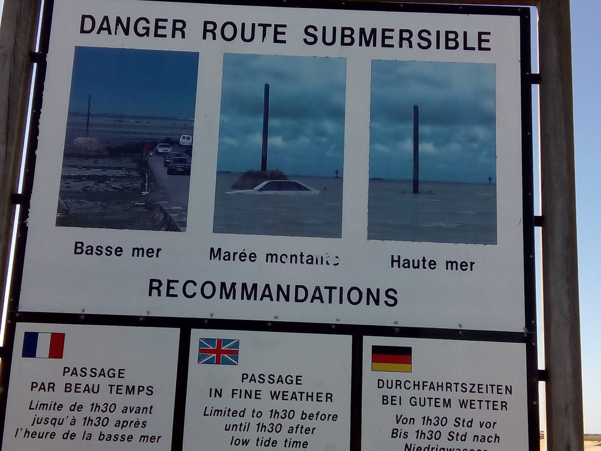Y más adelante, ya a la vista del paso, un enorme cartel con los horarios de mareas iluminados y las horas en que se podía pasar ese día. Estos carteles tan útiles y curiosos se pusieron por primera vez en 1830 para evitar los accidentes por desconocimiento. Finalmente, en el mismo paso, un cartel atemorizante mostraba la inundación progresiva de la carretera, que había engullido a un coche:
