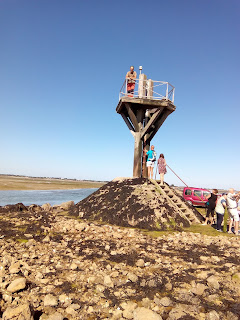 Cada quinientos metros más o menos la carretera tiene unos refugios por si a alguien le sorprende la subida de la marea que tenga donde guarecerse. Los más sencillos son unos simples postes de madera con una escalinata, y los más complejos un balconcillo encima de un poste: