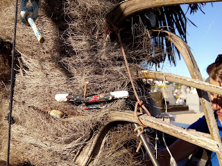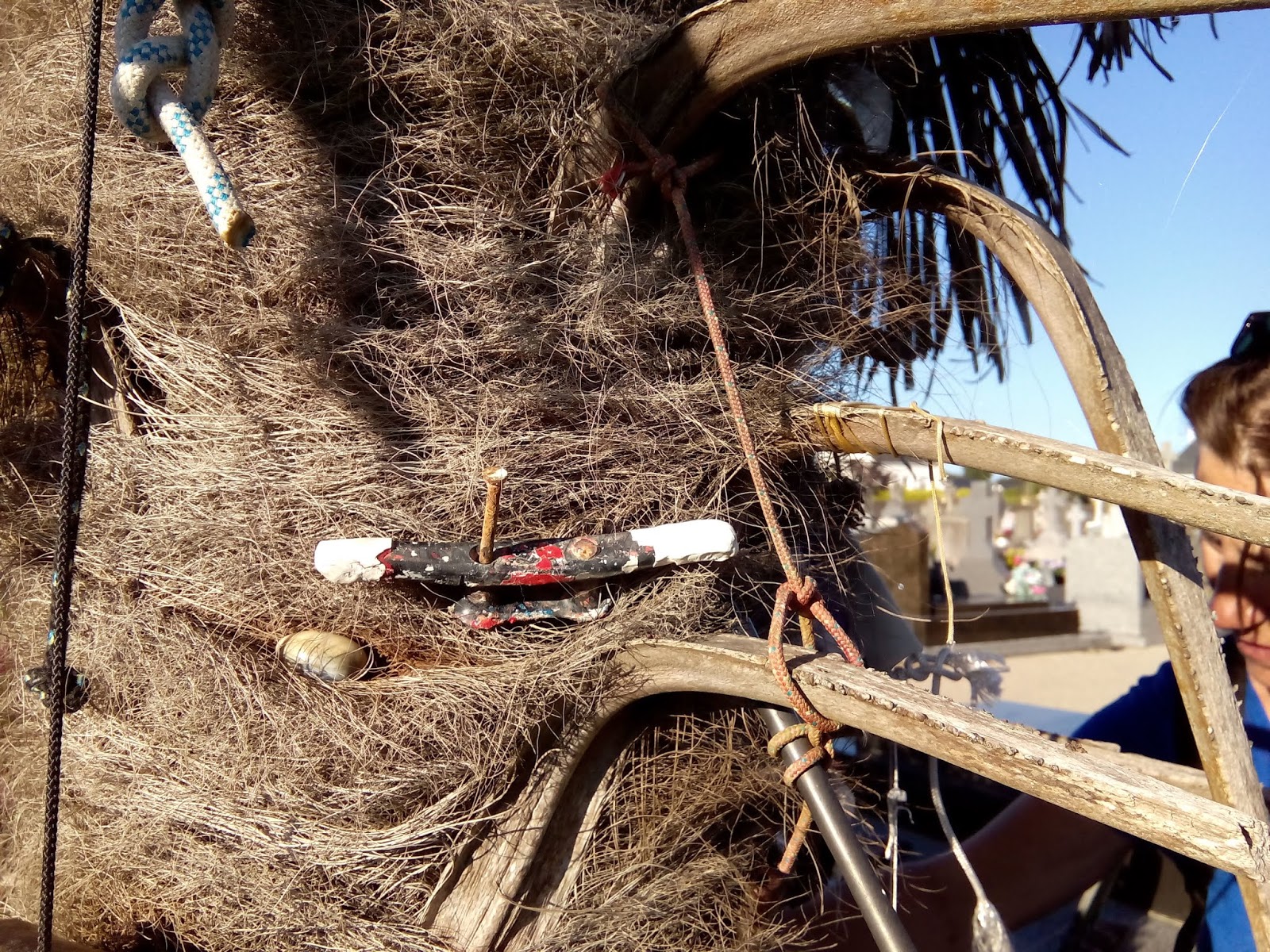 Resultó que en Bono no había ningún monumento o calle dedicada a él, y Ana y yo sólo pudimos visitar su tumba en el cementerio. Sin ninguna referencia, pues estaba vacío de visitantes, fuimos recorriendo las tumbas una a una buscando su nombre. Había un mausoleo dedicado a las víctimas del mar, pero allí no aparecía. Después de mirar todas las lápidas y no encontrar la suya, algo nos llamó la atención en una esquina, una palmera con infinidad de cositas colgadas. Al acercarnos por un sendero empedrado comprendimos que aquél era el sitio. Junto al muro, al fondo del cementerio, una piedra en el suelo, colocada vertical, decía: