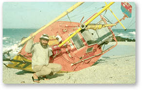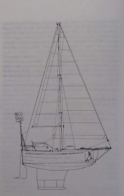 Serge se había construido él mismo su barco, de aluminio, y lo hizo a medida. Ya tenía experiencia en construir otros barcos, y hasta su propia bicicleta de niño, en el taller de metalurgia de su padre. No tenía presupuesto para un barco mayor y pensó que el punto clave no era el tamaño sino la seguridad. Por eso se hizo un velero insumergible, autoadrizable (¡para 3,6 metros de eslora tenía 1,5 metros de quilla!) y que se pudiera manejar siempre, en cualquier condición meteorológica, desde el interior de la cabina. A cambio el espacio de estiba era mínimo pues el barco era poco más que su cama rodeada de algún mueble y cajón de estiba: De hecho no tenía bañera y los winchies estaban al revés: situados en cubierta pero con las manivelas en su parte inferior, colgando del techo de la camareta. Podía izar y arriar las velas, tomar los rizos y manejar las escotas desde el interior: El precio que tuvo que pagar por esa seguridad es que dió la vuelta al mundo sentado en la misma posición (la que veis en el esquema anterior), muchas veces con los cojines mojados, lo que se tradujo en muchos episodios de llagas y forúnculos en el trasero que le hicieron la vida imposible, y la atrofia de los músculos de las piernas en las travesías oceánicas (varias semanas sin andar). Además cuando sufría temporales en los mares cálidos debía navegar con la camareta cerrada para que no entrasen las olas, con lo que el barco se convertía en una sauna y tuvo muchas dermatitis por el calor. Otro de los inconvenientes inesperados es que como las olas barrían constantemente la cubierta, le salían algas e incrustaciones no sólo por debajo de la flotación sino también por encima, con lo que los pequeños paseos por la cubierta para pescar, asearse o hacer de vientre eran un ejercicio de patinaje. A cambio las ventajas de un barco pequeño fueron muchas. Siempre tenía sitio en las marinas, y en muchas de ellas le hicieron servicios especiales o le dejaron amarrar gratis. Si no había sitio en los pantalanes podía quedarse en la escalera de los anexos, porque en realidad no era más grande que las zodiac de los otros veleros. Al puerto de Cayenne llegó para carenar y resultó que no tenía rampa de varada. Una draga que estaba limpiando el río sacó al barco del agua con su grúa, le posó en su cubierta, donde pudo limpiarlo y pintar los bajos y la misma grúa le devolvió al agua. Varó en varias ocasiones pero al ser el barco de aluminio consiguió sacarlo de las varadas sin problemas. En una de ellas, que el mar le había dejado muy alto en una playa, en lugar se salvar la varada por el mar lo hizo por carretera: una grúa le puso en el remolque de un todoterreno y le reflotaron en el puerto. La inventiva de Serge no tenía límites. Cada vez que pescaba un atún o una dorada grandes por el sistema clásico de la cacea se veía obligado a limpiarlo, secarlo o envasarlo al vacío, lo que con los medios de a bordo era más bien difícil (tenía una cocinita de alcohol que en dos ocasiones le produjo un incendio). Entonces se fabricó un fusil submarino con el bichero para cazar a los peces piloto que siempre nadan bajo los barcos, que son de tamaño más adecuado para la ración del día. Así no tenía que conservarlos y los tenía siempre frescos. La escasez de espacio generó también algunas situaciones curiosas. Por ejemplo, en el Canal de Panamá es obligatorio que embarque un práctico del Canal y 4 amarradores, pero en aquél barquito era imposible y lo pasó solo, lo que ha debido ser el único caso en la historia del Canal. Y como muchos trasmundistas se enemoró por el camino, en Sudáfrica, pero su chica no pudo acompañarle el resto del viaje porque no cabía a bordo, o sea que fue por otros medios hasta Australia para esperarle allí. Con esa vuelta al mundo Serge batió un récord que, según creo, aún no ha sido superado. Después ha seguido navegando y el la última foto podéis verle con sesenta y tantos años visitando su antiguo barco, que ahora está expuesto en un museo. También podéis ver el detalle del enrollador de botavara para la vela mayor. Un personaje digno de conocer.